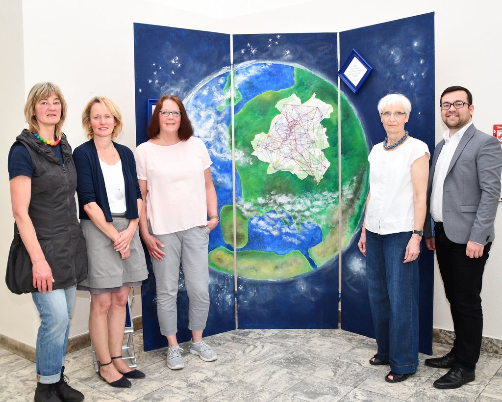 Das Thema der Werke ist Heimat. Entstanden sind sie auf Initiative von Martina Schulte von der Kunstschule "Kunst mal anders". Künstlerinnen und Künstler aus verschiedenen Altersgruppen bemalten Stellwände. Claudia Funcks Darstellung von "Industriekultur" ist ebenso zu sehen wie das Gemeinschaftswerk, das die Erde mit einer integrierten Stadtkarte Schwertes darstellt. Bürgermeister Dimitrios Axourgos zeigte sich angetan, nachdem die Künstlerinnen ihre Darstellungen erklärt hatten: "Wir unterstützen die kreativen Künstlerinnen und freuen uns, dass ihre Werke unsere Flure verschönern."