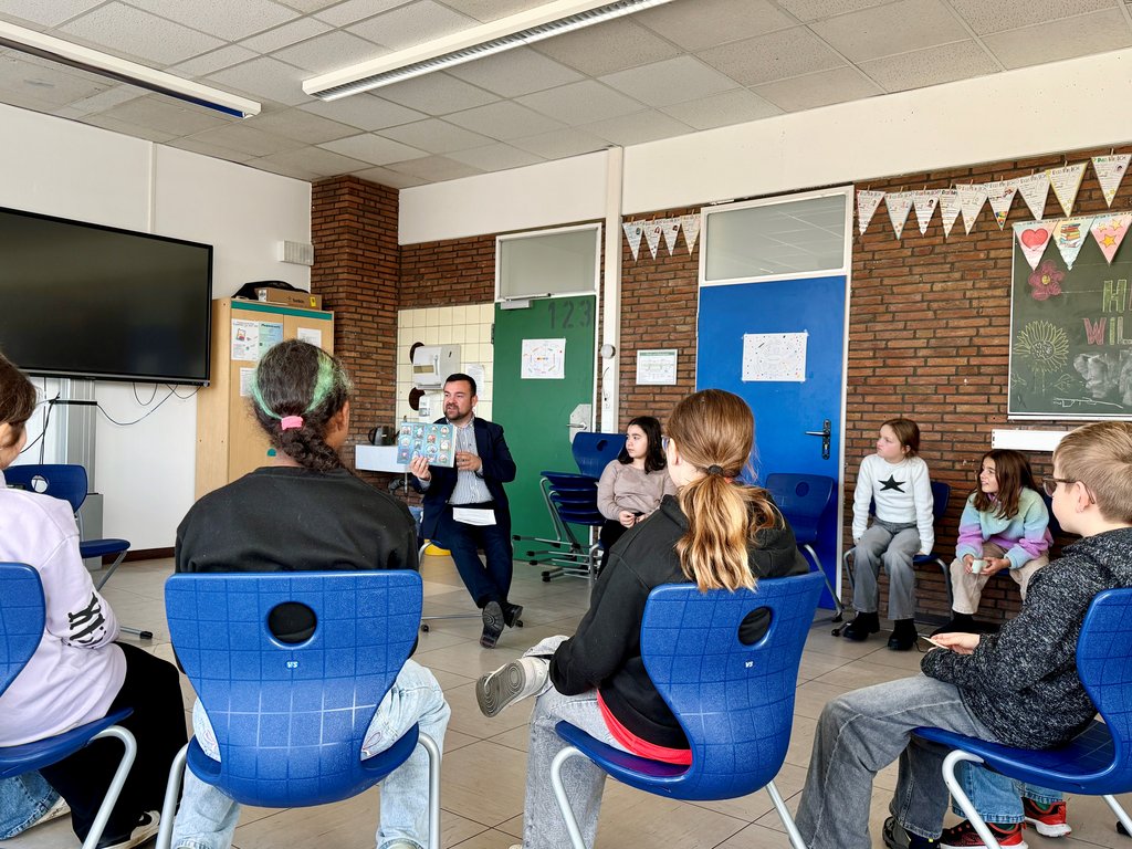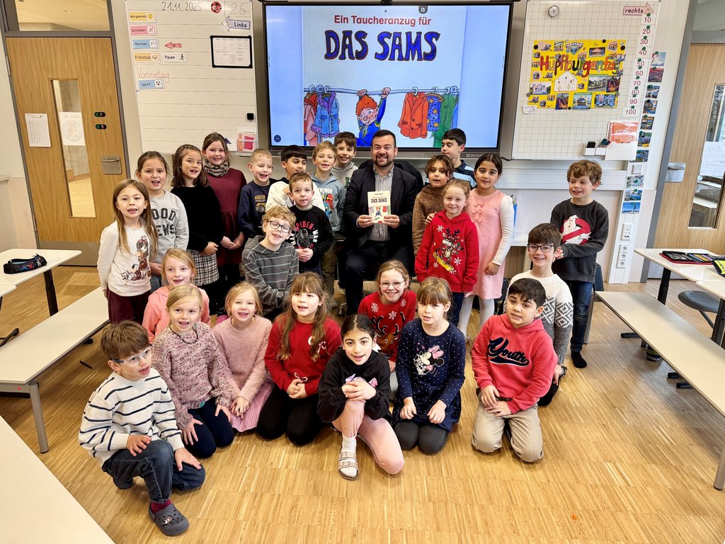An der Albert-Schweitzer-Schule las er gemeinsam mit Schüler*innen der 2. Klasse aus Paul Maars „Ein Taucheranzug für das Sams“. Anschließend folgte eine Lesung an der Gesamtschule Gänsewinkel, wo er Fünftklässler*innen aus „Die magische Bibliothek der Buks –Das verrückte Orakel“ von Nina George und Jens J. Kramer vorlas.