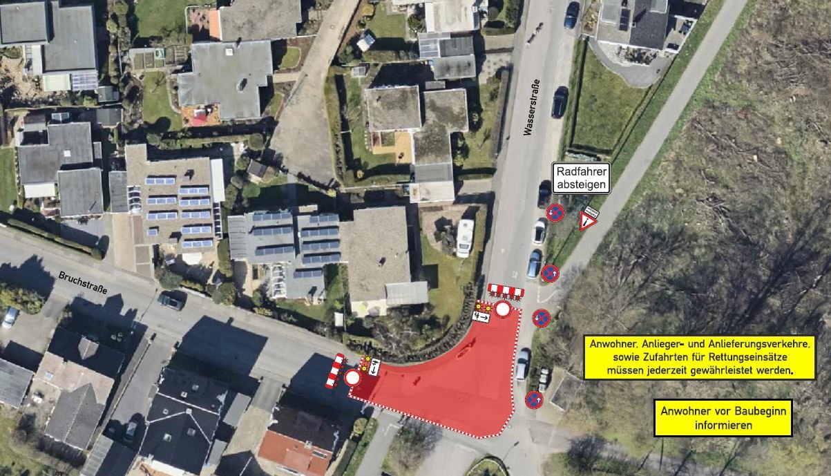 Westhofen. Knapp drei Wochen lang müssen Anwohner*innen der Bruchstraße und der Wasserstraße in Westhofen mit Behinderungen rechnen. Im Einmündungsbereich Wasserstraße/Bruchstraße werden Wasserleitungen erneuert und die Straßendecke saniert. Deshalb ist dieser Bereich für den Durchgangsverkehr komplett gesperrt. Eine Umleitung ist eingerichtet. Die Maßnahme beginnt am 2. Oktober und dauert bis zum 20. Oktober 2023 und wird auch den Ruhrtalradweg tangieren: Radfahrer*innen müssen im Baustellenbereich absteigen, werden aber im Zuge der Baumaßnahme einen gemeinsamen Rad-/Gehweg erhalten, der die Sicherheit an dieser Stelle erhöhen soll.