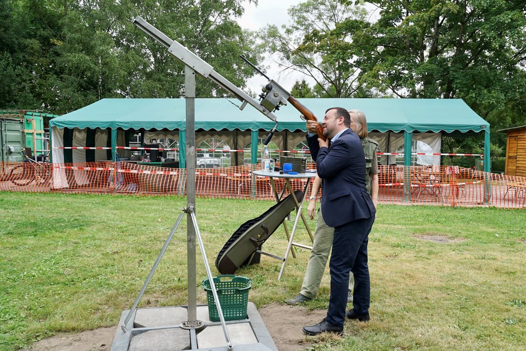 Zu den Gästen zählte auch Bürgermeister Dimitrios Axourgos. Gemäß der Tradition gab er ebenfalls einen Schuss auf den Vogel ab – nachdem er den Verein wenige Tage zuvor bereits im Rathaus begrüßt hatte.