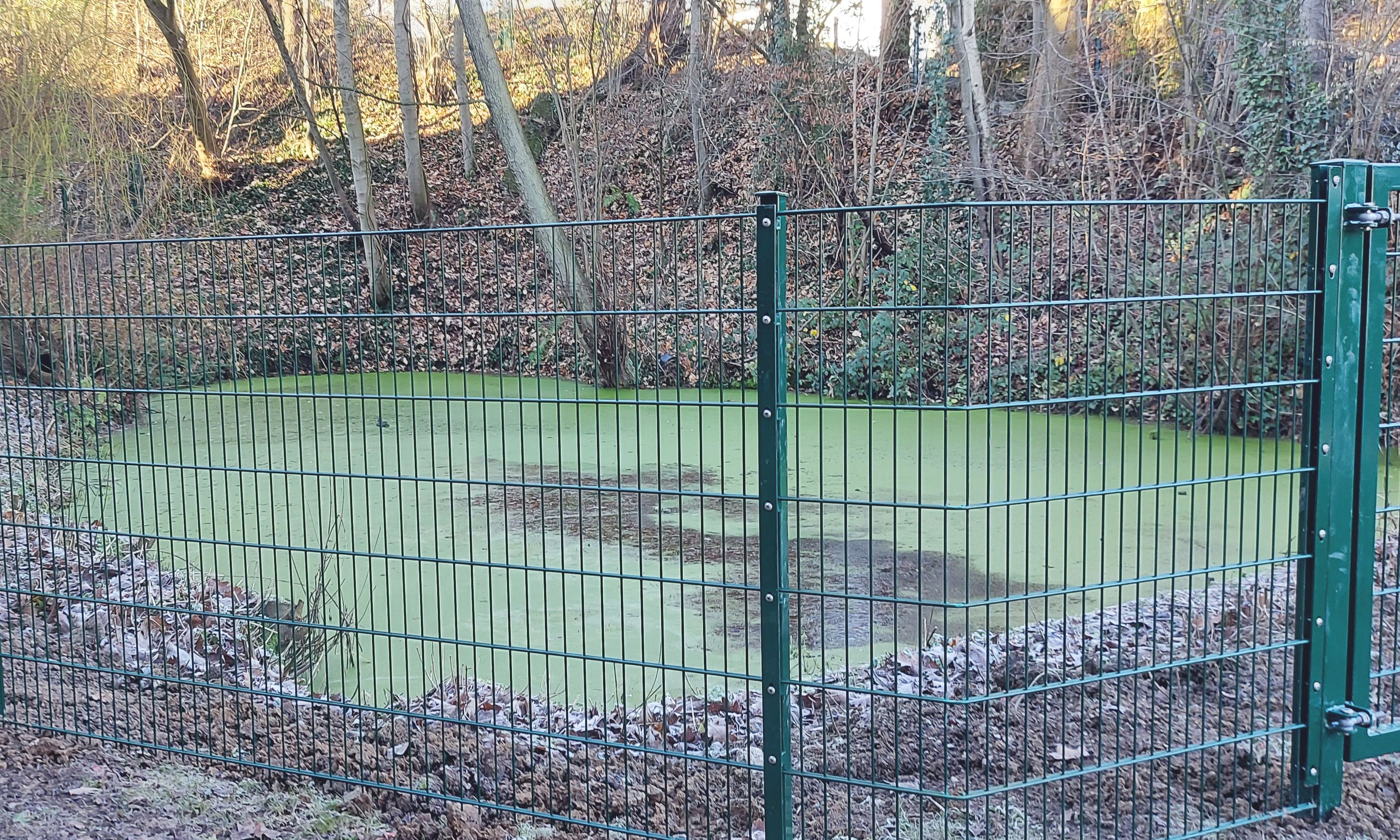 Geschehen ist das an den letzten Tagen des Jahres 2021. Die Stadt kam damit Wünschen von Anliegern nach, die an der Straße „Am Feuerteich“ wohnen bzw. die in das darüber liegende Neubaugebiet in der Minna-Marcus-Straße gezogen waren. Ein Fußweg, der direkt am Feuerteich vorbeiführt, verbindet diese Bereiche. Und so waren auch Sicherheitsbedenken von Eltern ausschlaggebend für den Auftrag an die Stadtentwässerung für den Bau eines Doppelstabmattenzaunes.