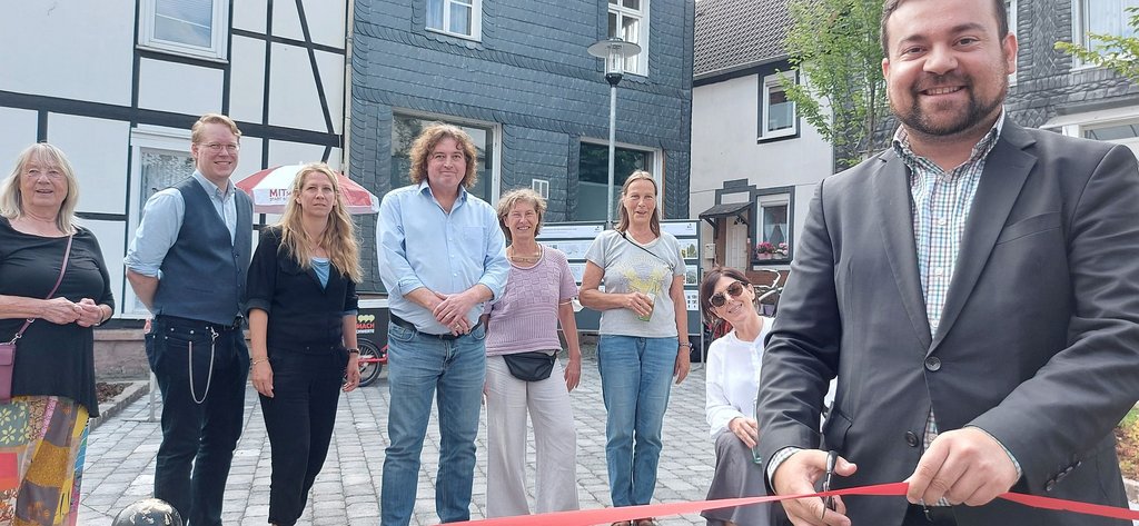 Plätze wie dieser mit hohen Aufenthaltsqualitäten sollen im Innenstadtbereich gleich mehrfach entstehen. Mit den Inhalten der Gestaltungsstudie konnten sich Bürger*innen am Dienstag vertraut machen und Informationen über die Startermaßnahmen einholen. Katja Freudenberger aus dem städtischen Planungsamt hatte alles rund um die Studie übersichtlich aufbereitet und Unterstützung erfahren von Anke Skupin und Dr. Christopher Wartenberg aus dem Büro der MitMachStadt. Die Schwerter Akkordeonspielerin Sandra Kubat sorgte für den musikalischen Rahmen.