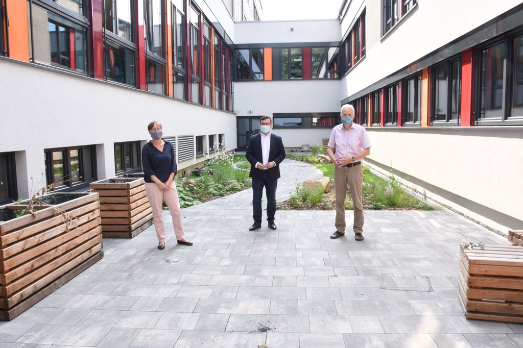 Der Bürgermeister besichtigte an der Gesamtschule Gänsewinkel auch das neu gestaltete Atrium. Mitten im Schulkomplex ist eine kleine, aber feine und lichtdurchflutete Oase entstanden, die u.a. von der Garten AG der Schule genutzt wird. Das Atrium war zum Abschluss der energetischen Sanierung der Schule neu gestaltet worden.