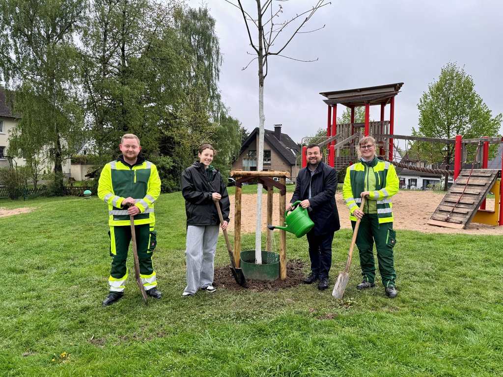 Die Pflanzung in Villigst ist bereits die vierte Aktion dieser Art in Schwerte. Bürgermeister Dimitrios Axourgos nutzte den Tag des Baumes, um sich gemeinsam mit Jennifer Kiehlhorn, stellvertretender Teamleiterin der Stadtbildpflege, Gärtner Julian Haarmann und Celina Tiemesmann, Sprecherin des KiJuPa’s, vor Ort ein Bild von dem neuen Baum und seinem Standort zu machen.
