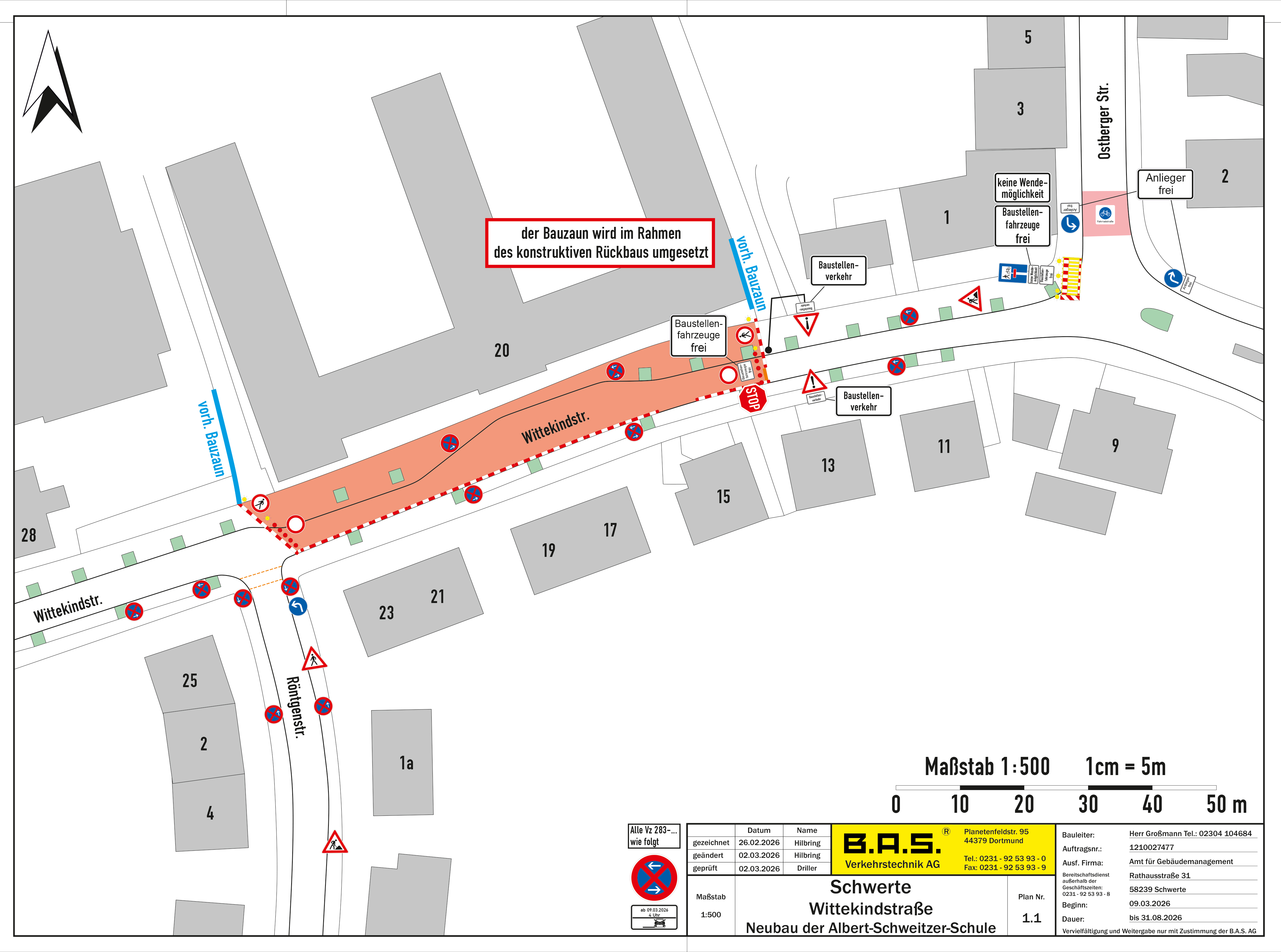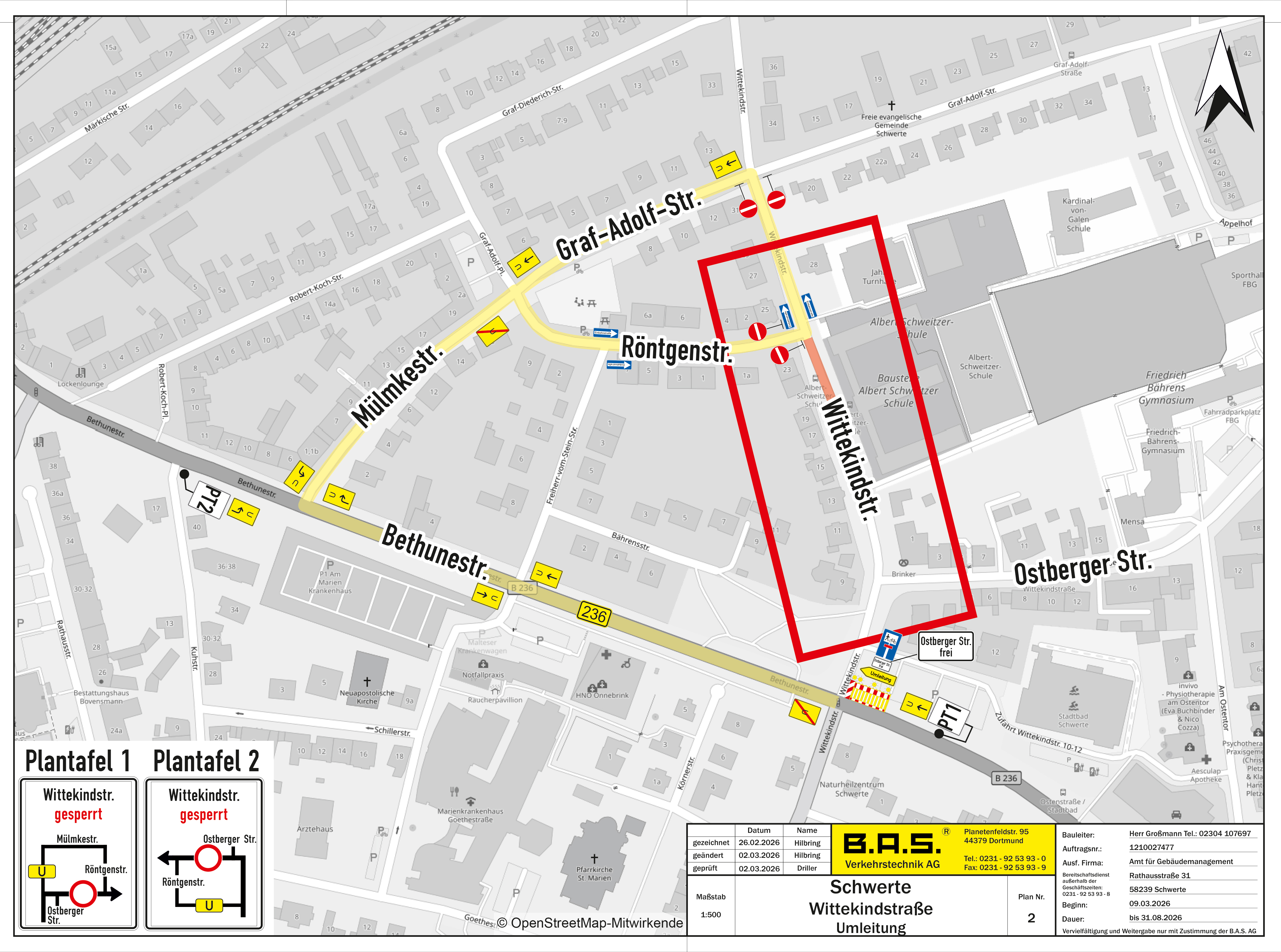 Damit einhergehend wird die Wittekindstraße in Höhe der Hausnummern 13 bis 23 voll gesperrt. Die Sperrung gilt vom 9. März bis 31. August 2026. Umleitungen werden eingerichtet.