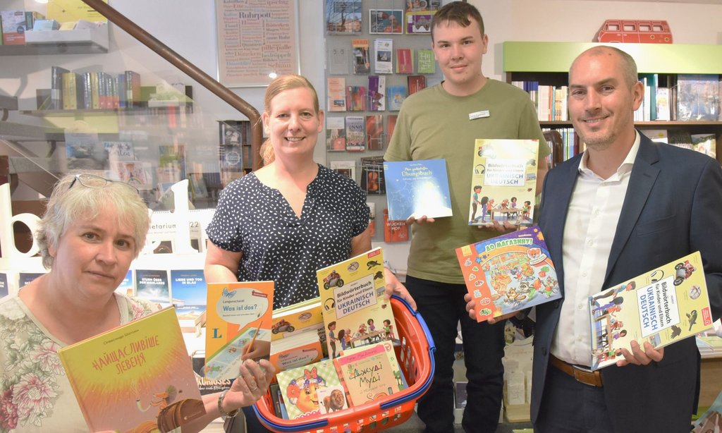 Tim Frommeyer, zuständiger Dezernent der Stadt Schwerte, und Christiane Klanke, Leiterin des städtischen Sozialamtes und Koordinatorin der Hilfsaktionen in der Ruhrstadt, nahmen das Bücherpaket jetzt aus den Händen von Eva Stapper, Inhaberin der Ruhrtal Buchhandlung, entgegen. „Wir haben überlegt, wie wir helfen können und haben dann gemeinsam mit dem Unternehmen Zeitfracht im Rahmen unserer Möglichkeiten gehandelt“, berichtete Eva Stapper.
