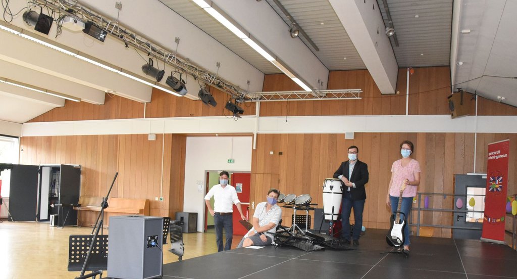 Bettina Austmeyer, Architektin in Diensten der Stadt Schwerte, berichtete dort über den Stand der Sanierungsmaßnahmen, die in den Sommerferien erfolgt sind. So wurde ein neues, mobiles Bühnensystem mit vielen baulichen Möglichkeiten in der Aula aufgebaut, nachdem der Fußboden unter der alten, dementierten festen Bühne dem restlichen Boden angepasst wurde. Neue Rauchschutztüren sind eingebaut worden. Der benachbarte Musikraum ist fertiggestellt und hat eine ebenerdige Verbindung zur Aula erhalten. „Obwohl die Aula in Coronazeiten auch für den Unterricht gebraucht worden ist, ist schon eine Menge gemacht worden“, erklärte Bettina Austmeyer.