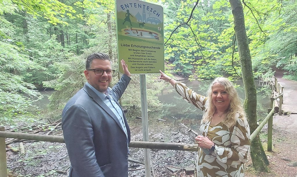 Auf den notwendigen Schutz von Gewässer und den dort lebenden Tieren, insbesondere während der Laichzeit, hatte CDU-Ratsfrau Bianca Dausend aufmerksam gemacht. „Wir haben diese Bitte bislang immer mit temporären Hinweisschildern während der Laichzeit umgesetzt. Da es sinnvoll ist ganzjährig auf den Schutz der Tiere und des Gewässers aufmerksam zu machen, habe ich die Kolleg/innen vom Baubetriebshof gebeten, feste Schilder am Ententeich zu installieren, “, erklärte Niklas Luhmann, Dezernent für Sicherheit und Ordnung der Stadt Schwerte.