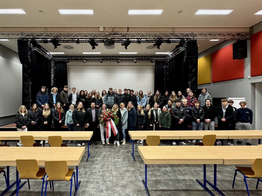 Bürgermeister Dimitrios Axourgos verabschiedete die Gruppe persönlich und überreichte ihnen im Namen der Stadt Schwerte einen Kranz. Er bat die Schüler*innen, diesen stellvertretend für die Stadt am Mahnmal niederzulegen – als Zeichen des Gedenkens und zum Andenken an die Opfer des Holocaust. „Die Erinnerung an die Verbrechen der Vergangenheit ist essenziell“, sagte Bürgermeister Axourgos. „Ich danke den Schüler*innen für ihr Engagement.“