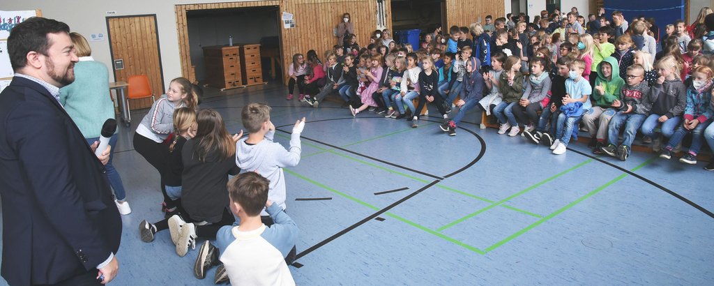 Es war ein knappes Rennen. 36 Stimmen waren auf das Holz-Tipi gefallen. Die Airtrack-Matte der Klasse 3b kam auf 32 Stimmen, gefolgt vom Hühner-Vorschlag der Klasse 2a (31) und den gleich aufliegenden Vorschlägen Kettcar (Klasse 3a) und Reckstange (2b) mit jeweils 30 Stimmen. „Das sind alles tolle Vorschläge“, befand Dimitrios Axourgos, der von Schulleiterin Julia van Halen begrüßt worden war.