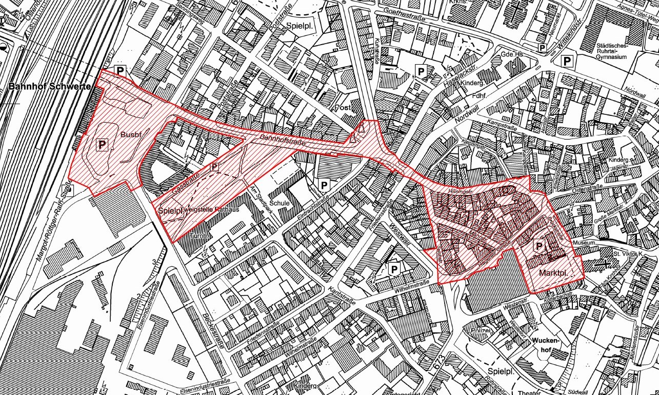 - Fußgängerzone: Hüsingstraße | Cava-dei-Tirreni-Platz | Mährstraße | Teichstraße | Werner-Steinem-Platz
