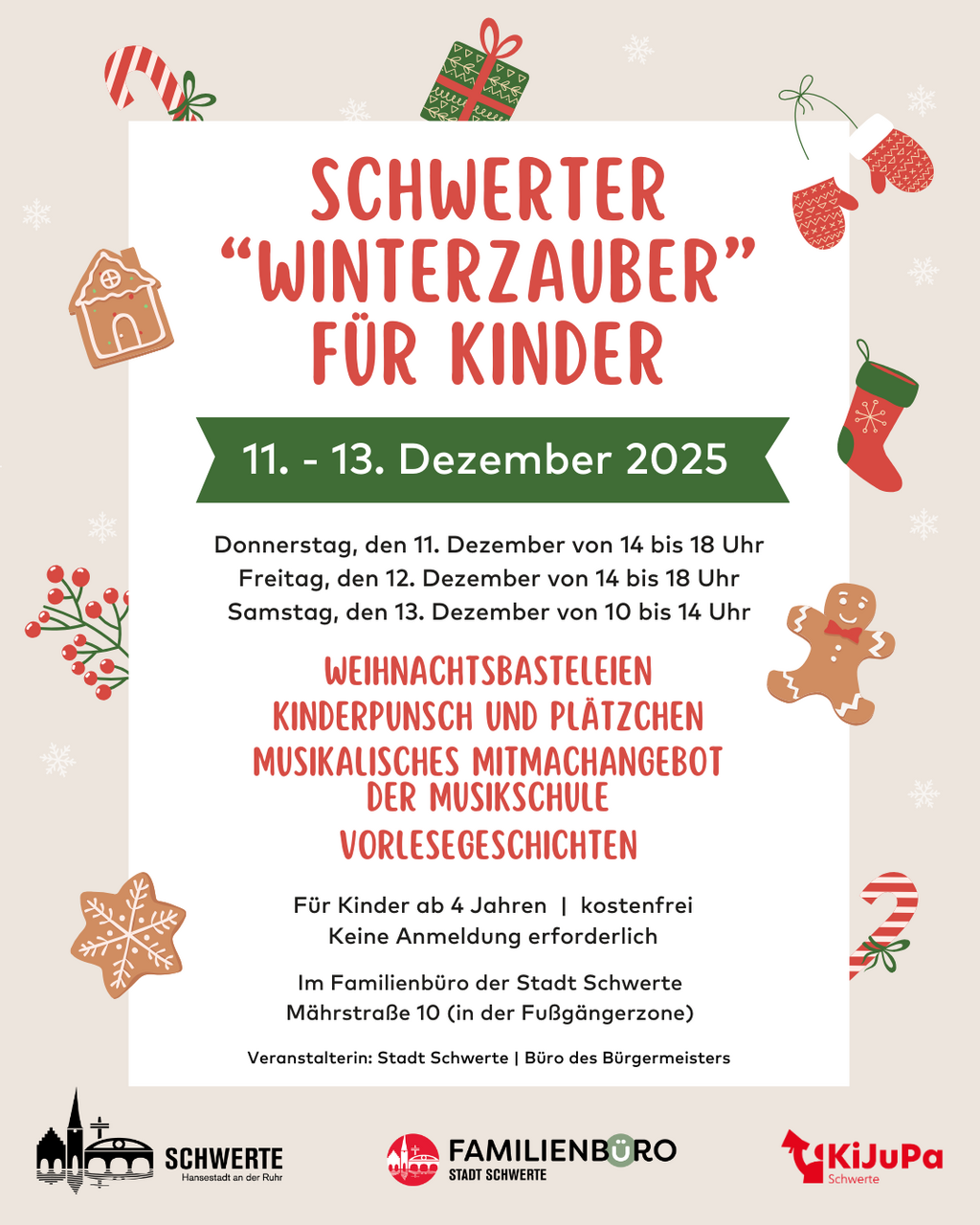 Kinder ab 4 Jahren können in gemütlicher Atmosphäre kreativ werden, spielen und die Vorfreude auf das Weihnachtsfest genießen. Der Winterzauber findet wieder direkt im Familienbüro der Stadt Schwerte statt. Dort stehen nicht nur die passende Infrastruktur bereit, sondern auch engagierte Mitarbeiter*innen der Schwerter Stadtverwaltung, die das Programm begleiten.