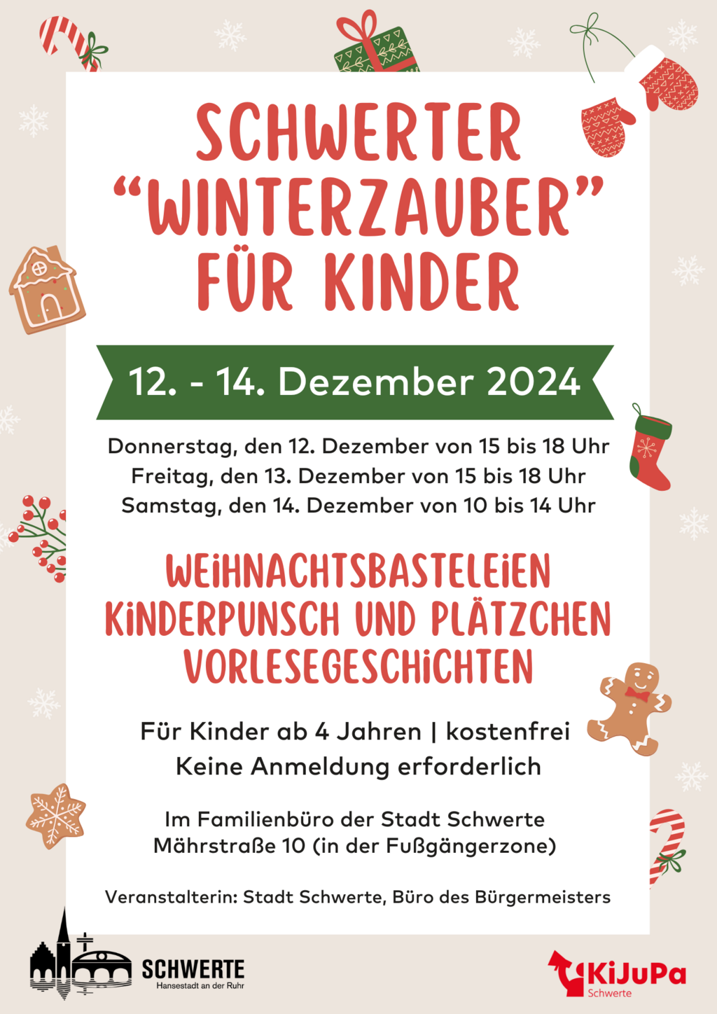 Kinder ab 4 Jahren können in gemütlicher Atmosphäre kreativ werden und die Vorfreude auf das Weihnachtsfest genießen. Nachdem im vergangenen Jahr eine leerstehende Immobilie als Veranstaltungsort diente, wird der Winterzauber diesmal direkt im Familienbüro der Stadt Schwerte ausgerichtet. Hier stehen nicht nur die passende Infrastruktur zur Verfügung, sondern auch die Fachkräfte des Jugendamtes, die mit ihrer Erfahrung und Begeisterung das Programm bereichern.