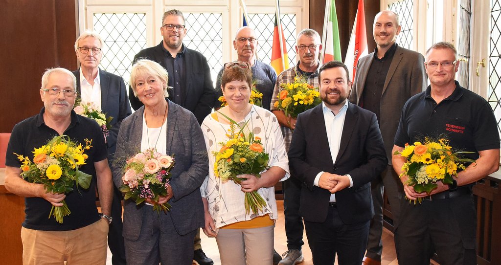 In Anwesenheit des Ersten Beigeordneten Tim Frommeyer, des Beigeordneten und Kämmerers Niklas Luhmann, der Amtsleitungen Bettina Austmeyer, Stephanie Roß, Peter Kranhold, Wilhelm Müller und Christian Struwe sowie Klaus Künzel als Vertreter des Personalrates dankte das Stadtoberhaupt allen für ihren Einsatz im Dienste der Stadt Schwerte und damit auch für die Bürger*innen. Ob Beigeordnete oder Amtsleitungen – alle unterstrichen die Loyalität, die Verlässlichkeit, die gute Zusammenarbeit und das Knowhow der Jubilare und Ruheständler.