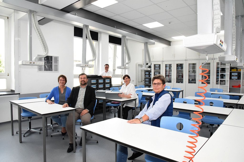 Ursprünglich war der Physikraum als eine Art Hörsaal mit hintereinander liegenden, aufsteigenden Tischreihen gestaltet. Diese starre Anordnung wurde jedoch durch ein flexibles Raumkonzept mit mobilen Tischen und einem Deckensystem für die Stromversorgung der neu entstandenen Arbeitsplätze ersetzt. „Dadurch sind jetzt vielfältige Unterrichtsformen umsetzbar, da sich die neuen Möbel je nach Bedarf der Lerngruppen anordnen lassen“, erklärte Schulleiterin Bärbel Eschmann beim Besuch des Bürgermeisters.