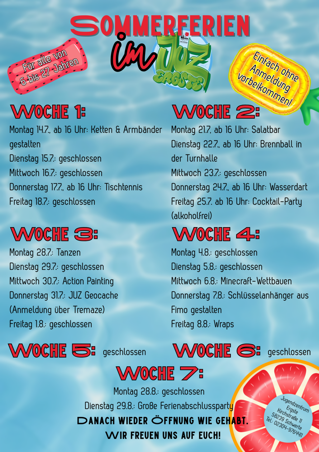 Das Jugendzentrum öffnet in den Ferien jeweils montags bis donnerstags von 16:00 bis 20:00 Uhr. Zusätzlich gibt es zwei besondere verlängerte Öffnungstage an den Freitagen: