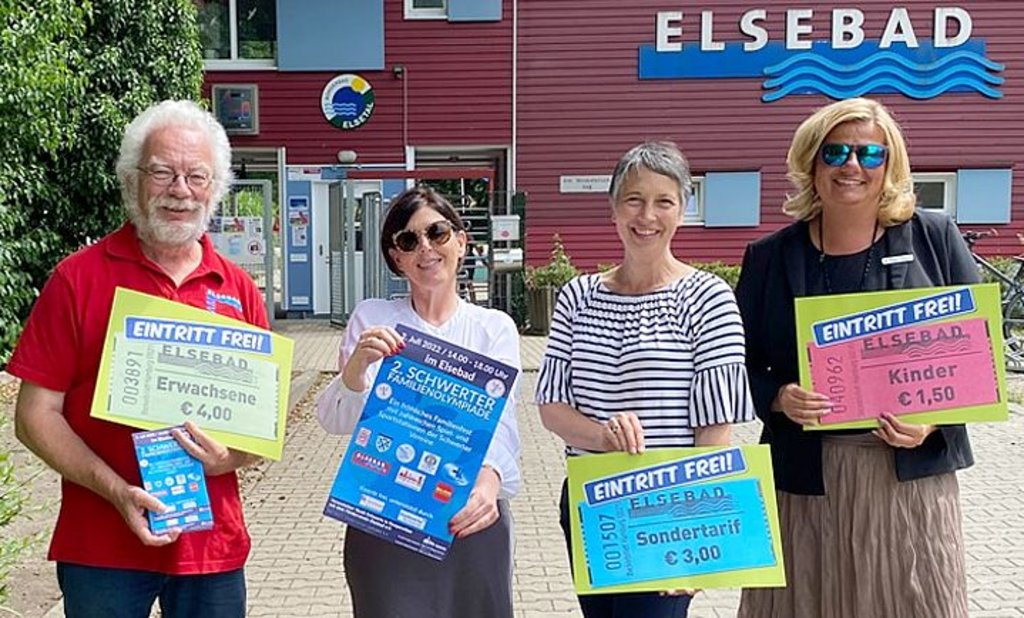 Den Eintritt für die Familienolympiade übernehmen die Sparkasse Schwerte und die Stadtwerke Schwerte. Michaela Zorn-Koritzius (Stadtwerke) und Michaela Hacheney (Sparkasse) trafen sich am Dienstag im Elsebad, um mit Gabriele Stange (Stadt Schwerte) und Thomas Wild (Förderverein Elsebad) letzte Einzelheiten zu besprechen.