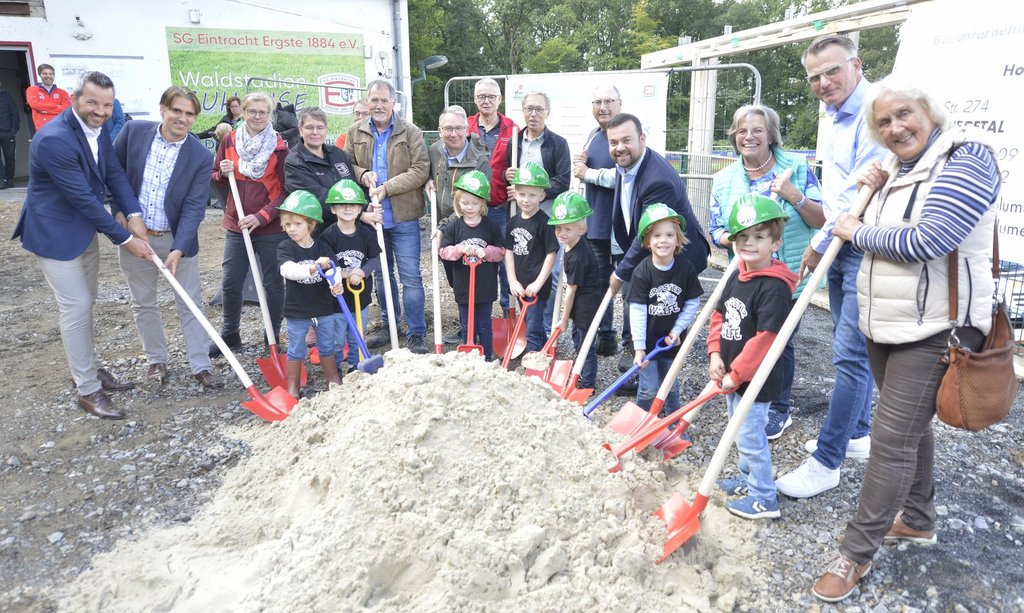 Gerade sie und die vielen anderen Fußballmannschaften der SG Eintracht Ergste sowie die Leichtathlet*innen des Vereins und auch die Grundschule sind es, die vom neuen größeren Kabinentrakt profitieren. Hatte es im alten Gebäude nur zwei Umkleidekabinen gegeben, sind es im neuen derer sechs. „Der Neubau ist dringend erforderlich, weil der Verein im Waldstadion an die Kapazitätsgrenzen gestoßen ist“, erklärte Dimitrios Axourgos und erinnerte an den November 2022, als NRW-Ministerin Ina Scharrenbach den Förderbescheid persönlich überbracht hatte.