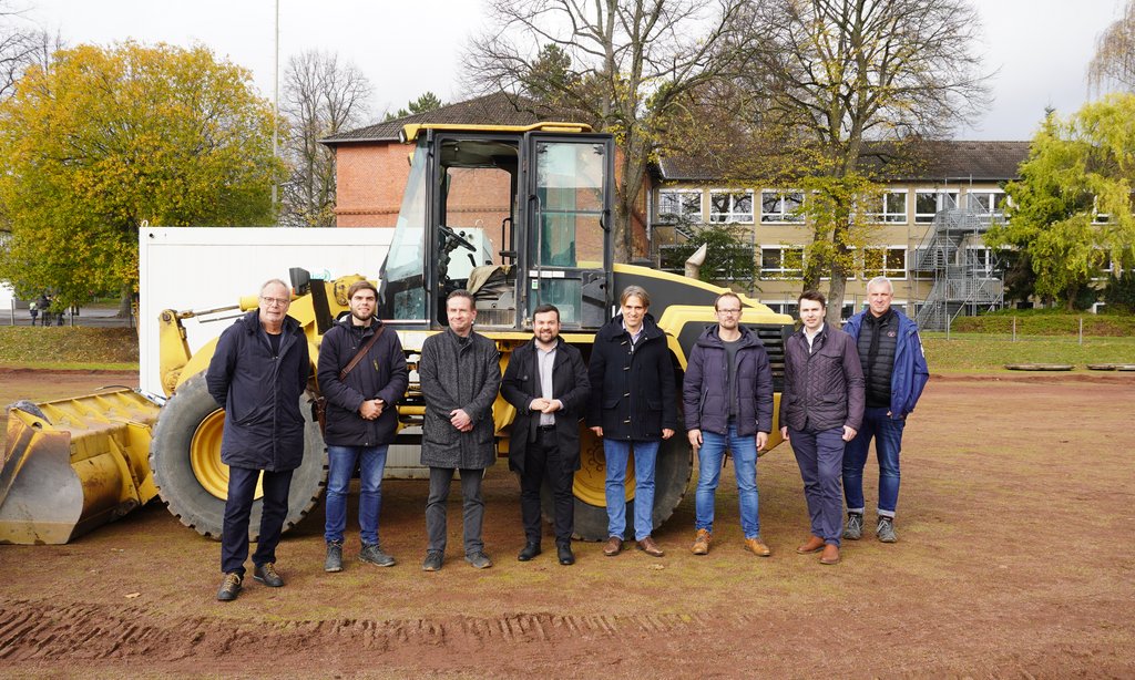 „Die neue Sportanlage bietet insbesondere dem Sportgymnasium Friedrich Bährens optimale Bedingungen für den Sportunterricht“, hebt Bürgermeister Dimitrios Axourgos hervor. Rund zwei Millionen Euro kostet die Anlage. Der Bürgermeister und der Technische Dezernent der Stadt Schwerte, Christian Vöcks, besichtigten jetzt gemeinsam mit den Schulleitern Heiko Klanke (FBG) und Dirk Schnitzler, Vertretern des Architekturbüros Lindner Lohse, der ausführenden Firma und des städtischen Architekten Andreas Großmann die Baustelle auf dem heutigen Sportplatz am FBG.