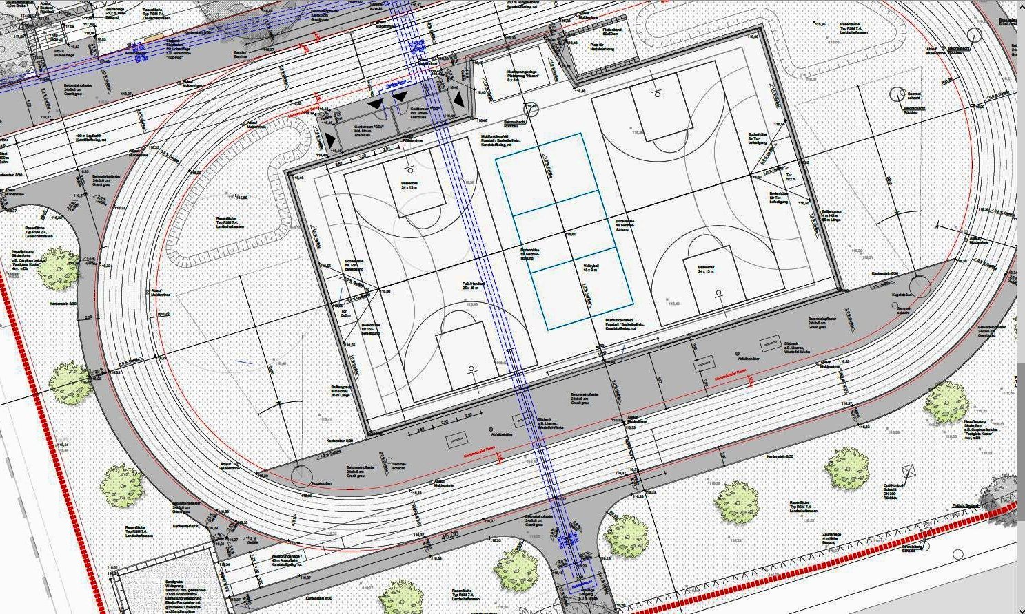 Die Nutzer*innen finden bald auf der neuen Sportanlage optimale Bedingungen. Sie entsteht auf der östlichen Seite des Sportplatzes und wird eingerahmt von einer 250m langen ovalen Kunststofflaufbahn mit vier Bahnen. Ein Kleinfeldspielfeld für Fußball und Handball ist ebenso vorgesehen wie Spielfelder für Basketball und Volleyball. Eine Weitsprunganlage, eine Hochsprunganlage und Anlagen fürs Kugelstoßen sind im ersten Bauabschnitt vorgesehen, ebenso eine 100m Bahn. Sitzbänke und viel Grün sind Bestandteile der Anlage.