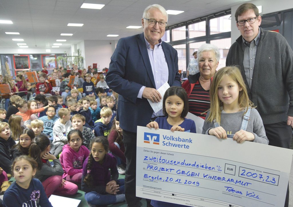Heidi Wenniges vom Sozialdienst katholischer Frauen, der das Projekt gegen Kinderarmut betreibt, war überglücklich, als sie den Scheck von zwei Schülerinnen der Schule überreicht bekam – in Anwesenheit des Schulleiters Tobias Köhle und des Ersten Beigeordneten der Stadt Schwerte, Hans-Georg Winkler. Die Stadt ist Trägerin der Schule Am Derkmannsstück.