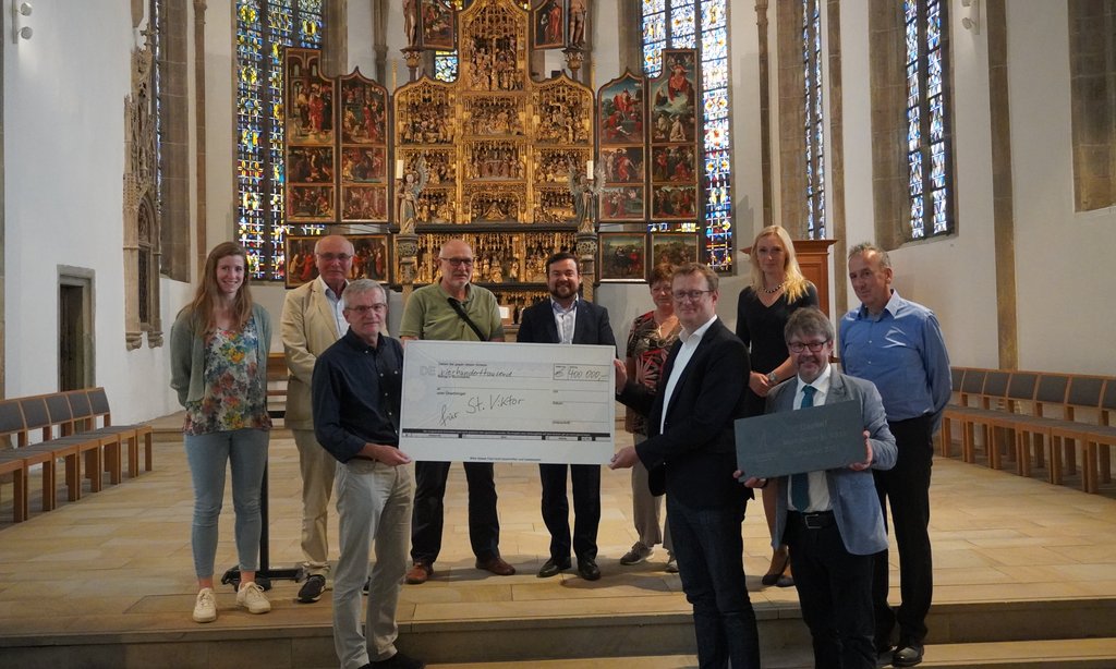 Bürgermeister Dimitrios Axourgos hielt im Gedenken an die Opfer der Unwetterkatastrophe inne, freute sich aber dennoch darüber, dass die St.Viktor Kirche als Wahrzeichen der Stadt aufwändig saniert und erhalten werden könne: „Der Scheck hilft uns dabei, unsere Marktkirche vielen weiteren Generationen zu erhalten. St. Viktor ist ein Zeichen der Hoffnung, das Sie unterstützen. Dafür danke ich im Namen aller Schwerterinnen und Schwerter.“
