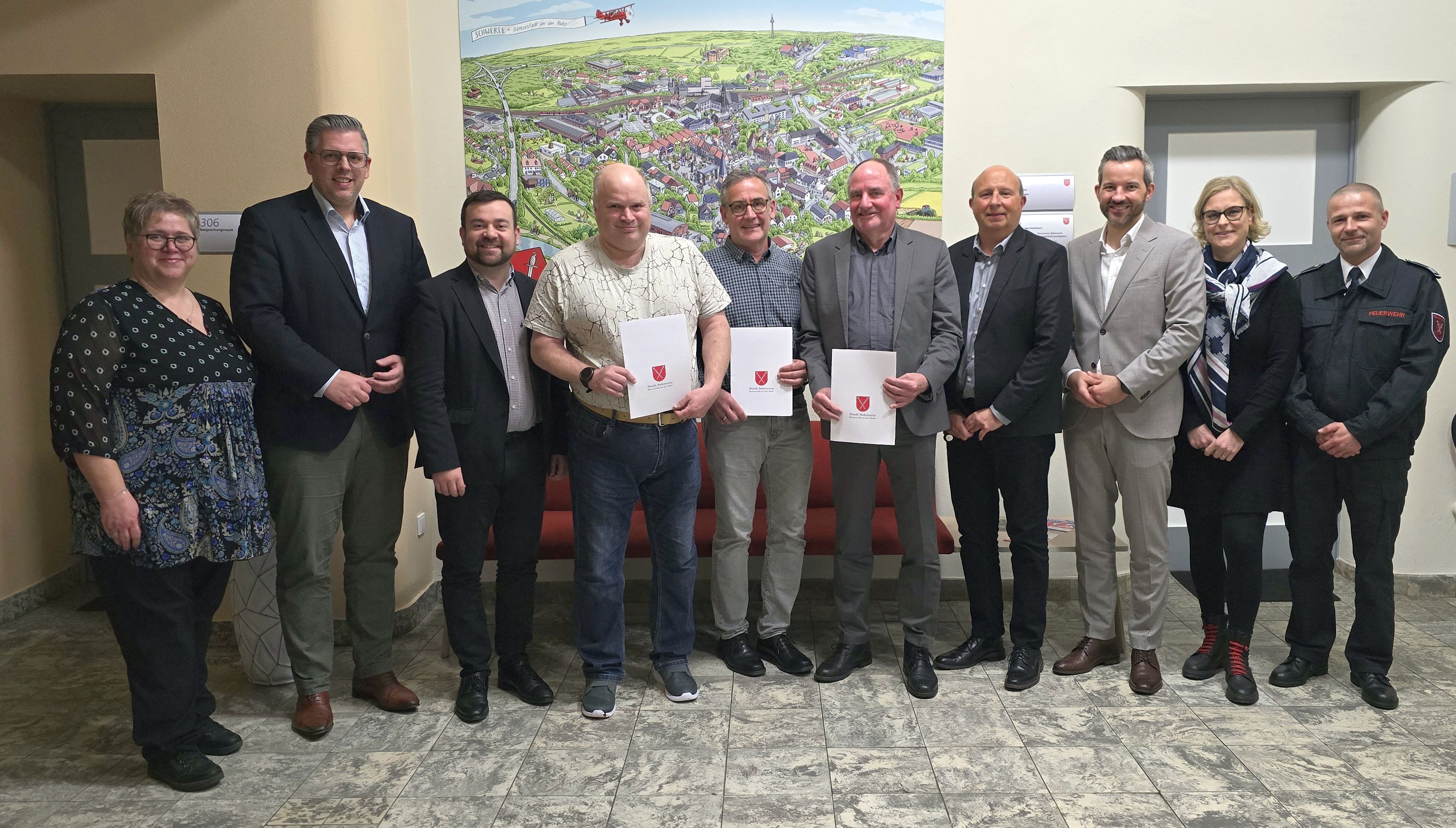 An der Ehrung nahmen neben Bürgermeister Dimitrios Axourgos, Dezernent Niklas Luhmann (Ordnung und Sicherheit), Co-Dezernent Christian Struwe, die neuen Amtsleiter Moritz Steffan (Feuerwehr) und Jan Sommer (Amt für Finanzen), die kommissarische Amtsleiterin Katja Kordt (Baubetriebshof) sowie Dorothee Brune vom Personalrat teil.