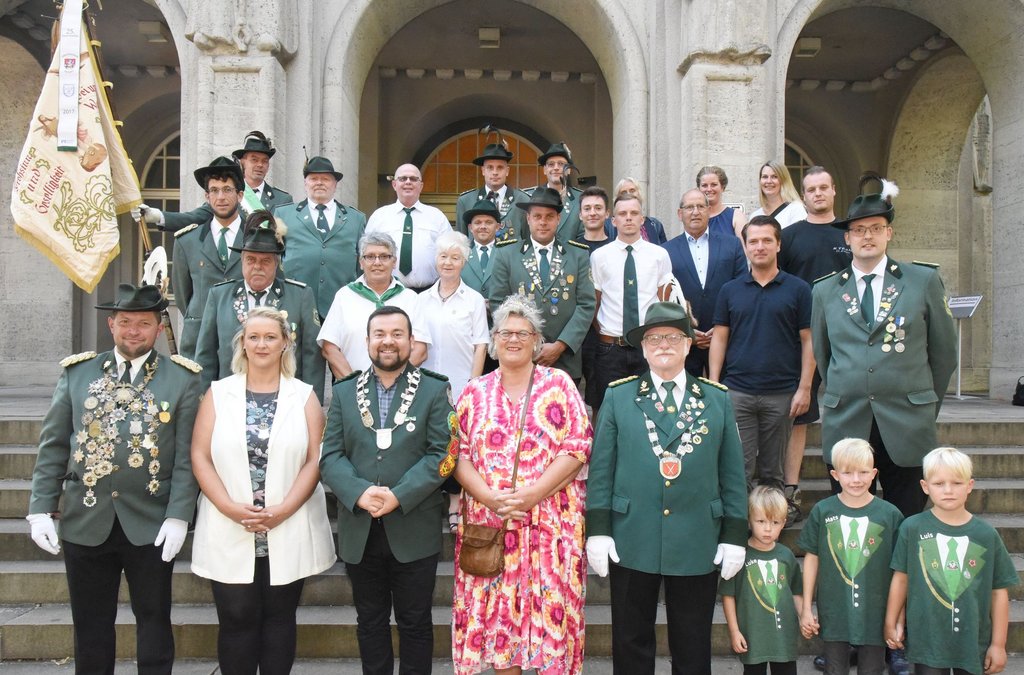 Es ist gute Tradition im Schwerter Rathaus, dass Schützenvereine im Vorfeld ihres Schützenfestes vom Bürgermeister, seinen Stellvertretern und Vertretern der im Rat der Stadt vertretenen Fraktionen empfangen werden. Dazu gehörten neben dem ersten stellvertretenden Bürgermeister Hans Haberschuss Renate Goeke (FDP-Fraktionsvorsitzende) und Marc Seelbach (SPD-Fraktionsvorsitzender). Auch das amtierende Stadtkönigspaar Dirk I. und Petra I. (Hanné) hatte es sich nicht nehmen lassen, den Ostschützen seine Aufwartung zu machen.