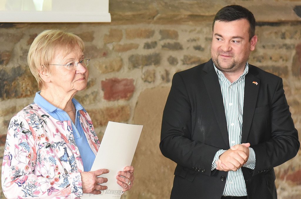 „Sie beide waren immer aktive und engagierte Bürger Ihrer Stadt, denen die Freundschaft zu Schwerte am Herzen lag“, würdigte Dimitrios Axourgos das besondere und impulsreiche Verhältnis zwischen den beiden Städten. Das ist natürlich auch insbesondere ein Verdienst von Wolfgang Stein, dem aktuellen Vorsitzenden des Schwerter Arbeitskreises Hastings. Das Stadtoberhaupt würdigte überdies die Verdienste von Dora Franz und überreichte ihr ebenfalls eine Urkunde: Die Schwerterin war mehr als zwei Jahrzehnte Vorsitzende des Arbeitskreises Schwerte/Hastings innerhalb der Städtepartnerschaftsgesellschaft Schwerte.