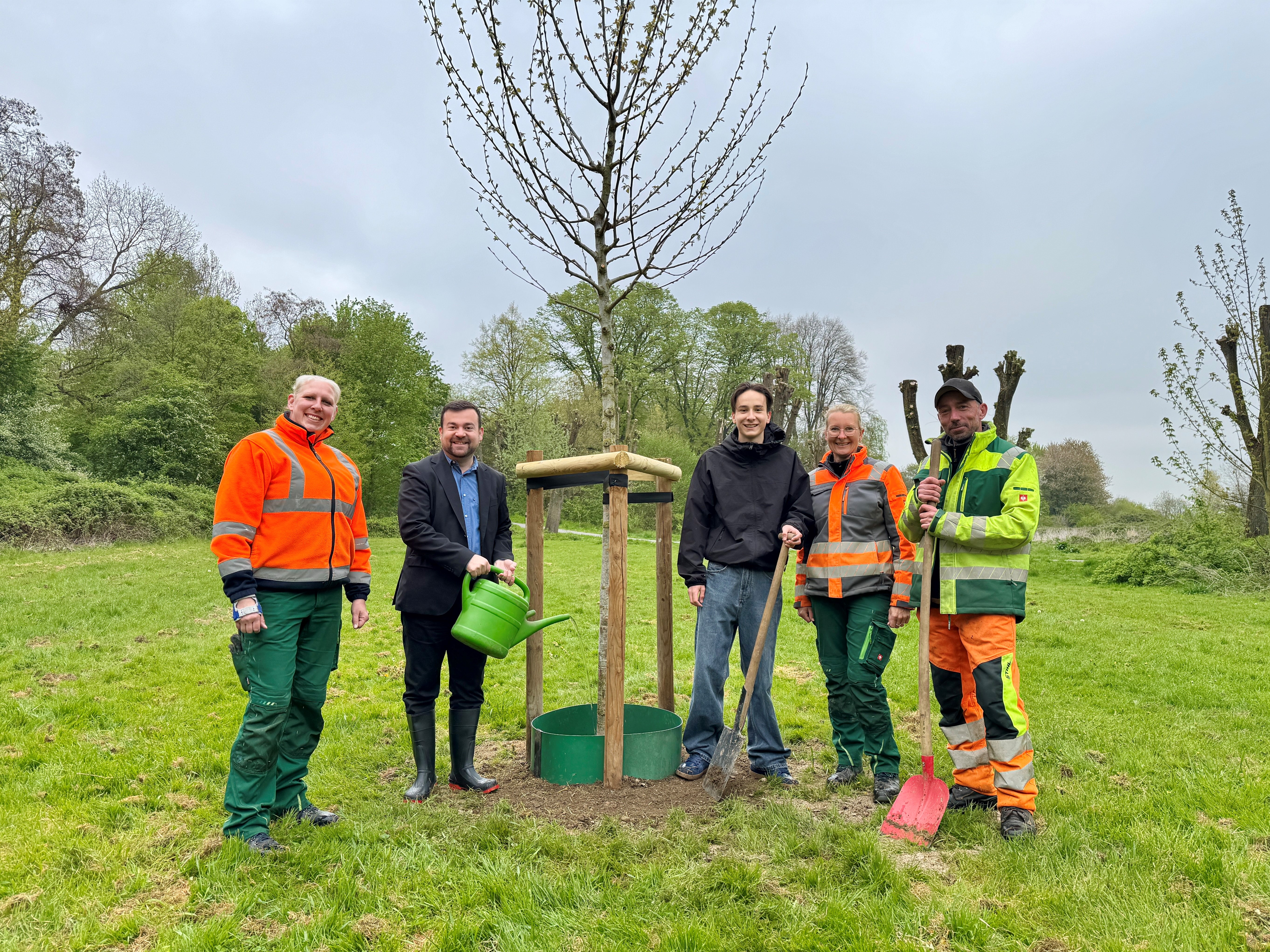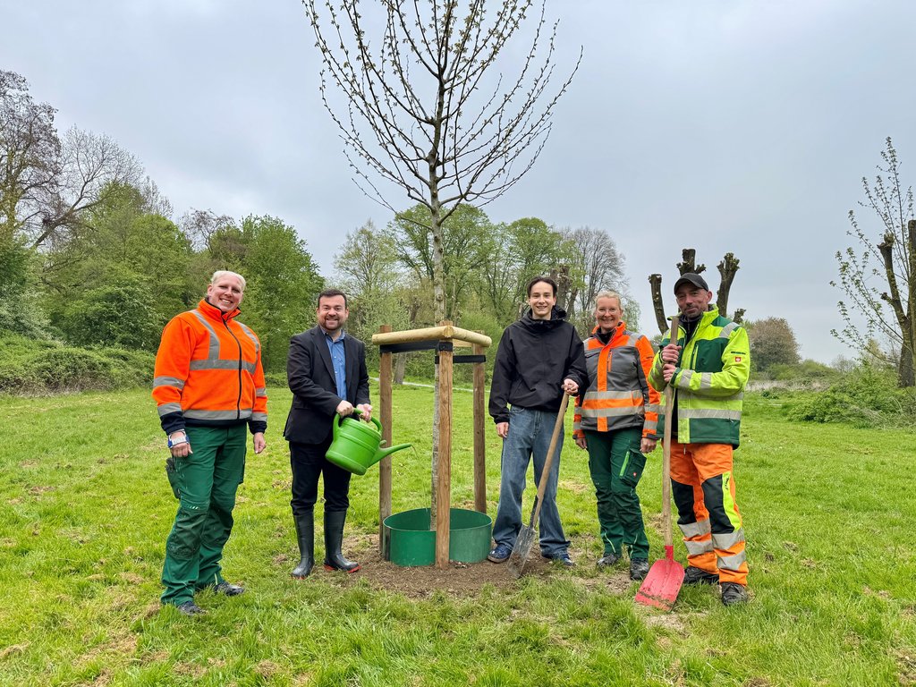 Bürgermeister Dimitrios Axourgos und Mats Teichmann, Sprecher des Kinder- und Jugendparlaments, begutachteten den neu gepflanzten Baum gemeinsam mit Kolleg*innen des städtischen Gärtnerteams. „Für diese Pflanzung ist wieder ein sehr schöner Standort gewählt worden“, so Axourgos.