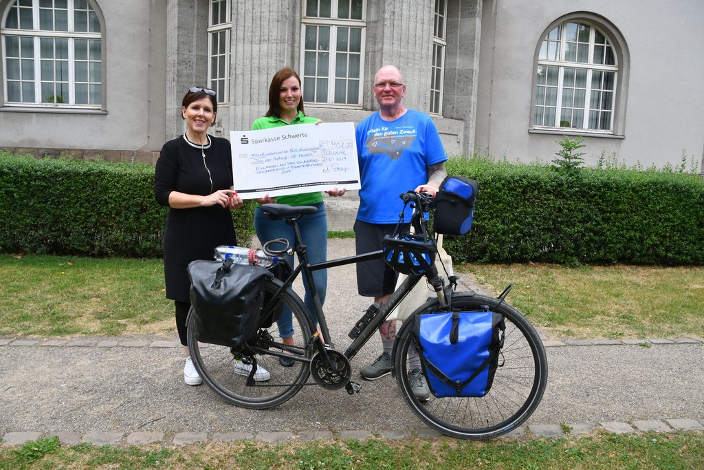 Gabriele Stange, die persönliche Referentin von Bürgermeister Dimitrios Axourgos, empfing den Radler. Sie zeigte sich schwer beeindruckt: "Was Olli Trelenberg alles auf sich nimmt, um soziale Projekte zu unterstützen, imponiert mir. Seine diesjährige Tour der Hoffnung ist ein Projekt, das jede Unterstützung verdient und ich bin mir sicher, dass all diejenigen, die zur Spendensumme beigetragen haben, das ebenfalls so sehen." Mit der Schwerter Klimaschutzmanagerin Jana Ermlich überreichte Gabriele Stange einen Scheck in Höhe von 901,20 Euro. Das Geld stammt aus der Fundräderversteigerung des Drahteselmarktes. Den Gesamtbetrag, den Oliver Trelenberg in diesem Jahr einfuhr, errechnet er während der kommenden Wochen.