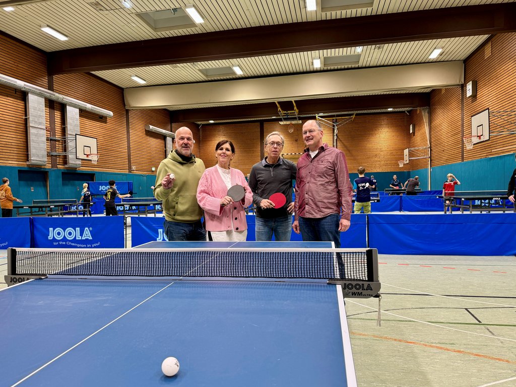 Gabriele Stange, als Amtsleiterin innerhalb der Stadtverwaltung zuständig für den Sport, und Peter Schubert, Vorsitzender des Stadtsportverbands, nutzten die Gelegenheit, die TTVg beim Training in der Sporthalle am Stadtpark zu besuchen. Dort erläuterten der 1. Vorsitzende Oliver von Colson und Geschäftsführer Markus Kleff den Gästen die Unterschiede verschiedener Tischtennisplatten, typische Trainingsabläufe und die Vereinsstrukturen.