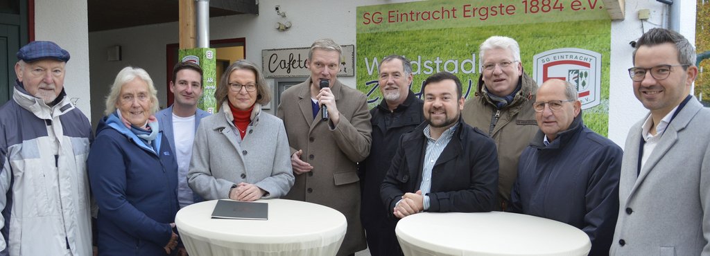 „Unsere Städte und Gemeinden machen sich fit: Sportanlagen werden modernisiert, barrierefrei ausgestaltet, energetisch saniert und vieles mehr“, sagt Ministerin Ina Scharrenbach über das Invstitionspaket. „Sportliche Infrastruktur gehört zur kommunalen Daseinsvorsorge.“ Dirk Kienitz, Vorsitzender der SG Eintracht Ergste, sprach von einem „sehr erfreulichen Tag“ und Ulf Schröder, stellvertretender Vorsitzender der SGE, Vorstand der Fußballjugendabteilung, meinte, „die Förderung hilft unglaublich, wir sind sehr glücklich“. Immerhin unterhält die Fußballabteilung alleine 18 Mannschaften.
