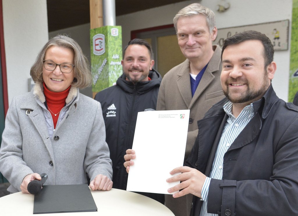 „Ich freue mich über diesen Termin und bin froh, den Förderbescheid heute entgegennehmen zu können“, dankte Bürgermeister Dimitrios Axourgos der Ministerin. Der Verein sei der größte in Schwerte und habe schon vieles in Eigenleistung realisiert. „Mittlerweile ist die Eintracht aber an Kapazitätsgrenzen gestoßen, was den Umbau notwendig werden lässt“, so der Bürgermeister.
