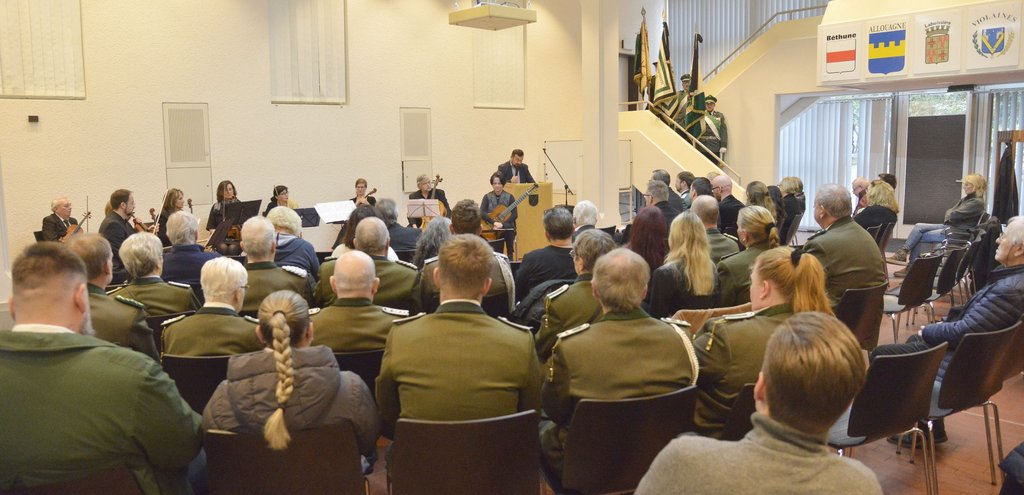 Das Ruhrstadt Orchester unter der Leitung des städtischen Kapellmeisters Claus Eickhoff hatte hatte die Gedenkfeier gemeinsam mit der Gitarristin Sabine Thielmann musikalisch einfühlsam umrahmt. Zuvor hatte Marco Gosewinkel, Geschäftsführer der Ortsgruppe, unterstrichen, dass „der Volkstrauertag nichts von seiner Bedeutung verloren hat. Er mahnt uns alle, die Schrecken der Vergangenheit nicht zu vergessen“.Mitglieder aus Schwerter Schützenvereinen beteiligten sich an der Gedenkfeier und der Kranzniederlegung.
