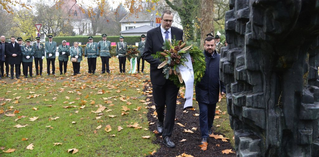 „Für den Frieden müssen wir uns einsetzen“, appellierte das Stadtoberhaupt an die Besucher*innen. „Dafür brauchen wir Aufmerksamkeit und Zivilcourage: Dass wir laut protestieren, wo wir Unrecht wahrnehmen. Dass wir helfen, wo andere missachtet und misshandelt werden. Der Volkstrauertag gibt uns einen Handlungsauftrag: uns aktiv für eine friedliche Gegenwart und Zukunft einzusetzen. Wir können uns aus den Konflikten um uns herum nicht heraushalten: eine jede, ein jeder von uns an dem Platz, an dem es möglich ist, und mit den Mitteln, die zur Verfügung stehen“.