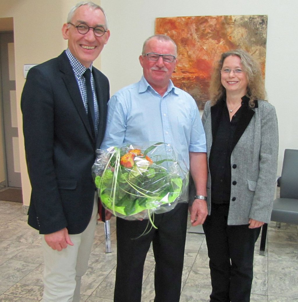 Anfang dieses Jahres wechselte Waldemar Spletter in den Bereich Abfallentsorgung. Er sammelt Müll in den Randgebieten der Stadt, reinigt Parkplätze und beseitigt wilde Kippen. Im Rahmen einer kleinen Feierstunde im Rathaus wurde er jetzt von Bürgermeister Heinrich Böckelühr geehrt.