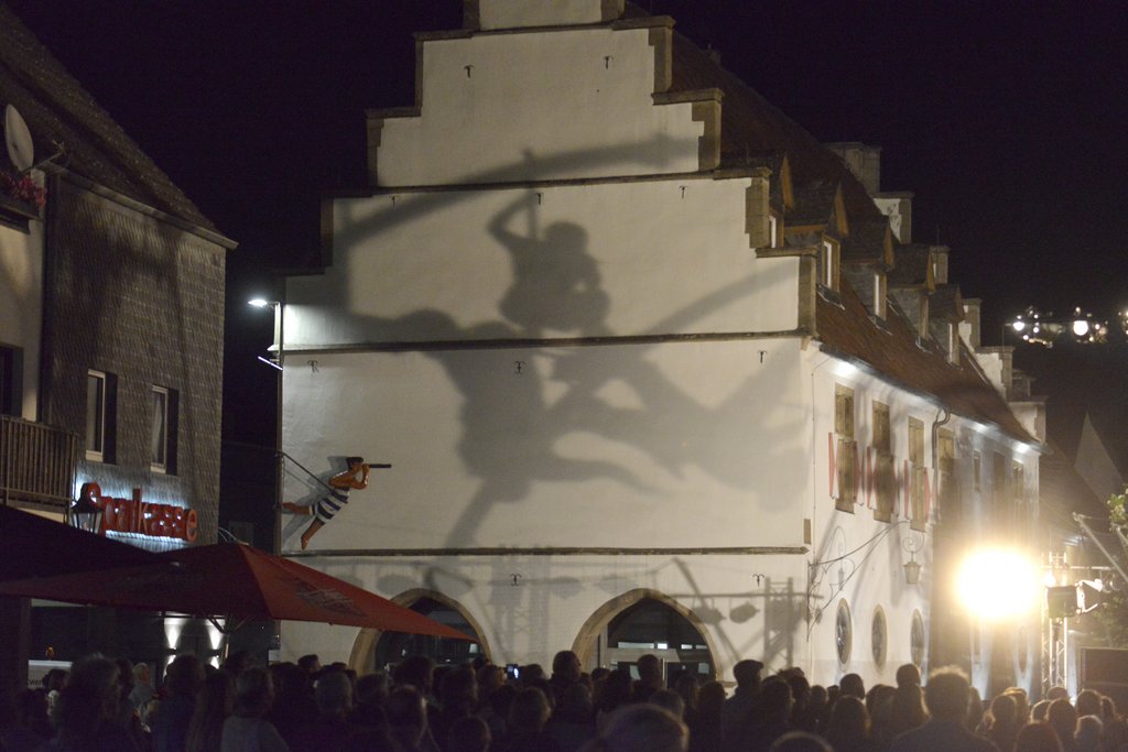 Wer große Artistik erleben will, war auf dem Markt gut aufgehoben, wo Omnivolant und Guts Pie Earshot ihre Show in luftiger Höhe präsentierten - die St. Viktorkirche bildete die ideale Kulisse. Ein nachhaltiges One-Man-one-Baum-Theaterstück präsentierte Peter Trabner an der Lärmschutzwand auf dem Gelände der Rohrmeisterei. "Der Tod des Empedokles" nannte der Schauspieler sein Stück - beeindruckend! Wer allerdings vorzeitig ging, erlebte Trabners blaues Wunder!