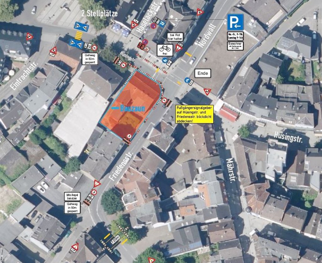 Im Herzen der Stadt haben die Bauarbeiten für das Café Extrablatt begonnen. Das behindert im Moment Fußgänger*innen im Querungsverkehr in die Fußgängerzone bzw. in Richtung Postplatz. So ist der Gehweg vor der Baustelle gesperrt, so dass sich die Friedensstraße nicht überqueren lässt. Weil Fußgänger*innen deshalb über den Nordwall queren müssen, hat sich die Stadt Schwerte entschieden, besagten Zebrastreifen für die Dauer der Bauarbeiten auf die Straße zu kleben, um einen gefahrlosen Wechsel auf die andere Straßenseite zu ermöglichen.