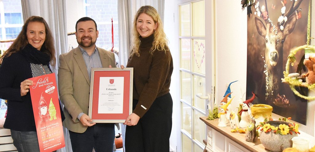 Dazu wird auch Dimitrios Axourgos gehören. Der Bürgermeister möchte live erleben, was die mehr als 30 Aussteller*innen im Angebot haben. Schon am Montag machte er den beiden Damen seine Aufwartung und überreichte eine Urkunde der Stadt Schwerte – wie immer, wenn ein Jubiläum ansteht. Damit verbindet das Stadtoberhaupt die besten Wünsche für eine erfolgreiche Zukunft.