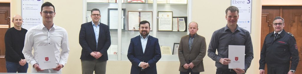 Neben dem Bürgermeister und dem Beigeordneten waren bei der Überreichung der Ernennungsurkunden noch Feuerwehr-Chef Wilhelm Müller, Christian Struwe als Leiter des Haupt- und Personalamtes und Klaus Künzel als Vertreter des Personalrates der Stadt Schwerte anwesend.