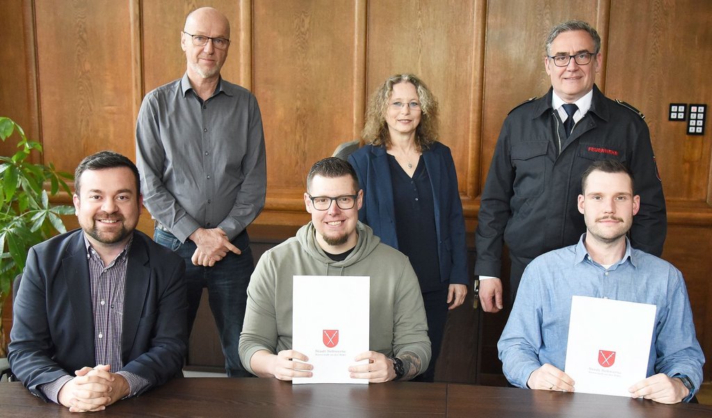 Benjamin Koch und Raphael Siewert setzen damit den Ausbildungsreigen bei der hauptamtlichen Feuerwehr der Stadt Schwerte fort. In Anwesenheit von Feuerwehrchef Wilhelm Müller, der Personalratsvorsitzenden Linda Schmidt und Dirk Wever aus dem Personalamt der Stadt Schwerte dankte Dimitrios Axourgos den beiden, „dass Sie sich für Schwerte entschieden haben. Auf Sie warten spannende Aufgaben und eine gut ausgestattete Feuerwehr, die technisch und digital bestens unterwegs ist“. Auch Wilhelm Müller hieß die beiden neuen Brandmeisteranwärter herzlich willkommen und verwies auf deren Eignungstest, „den Sie beide mit Bravour bestanden haben“.